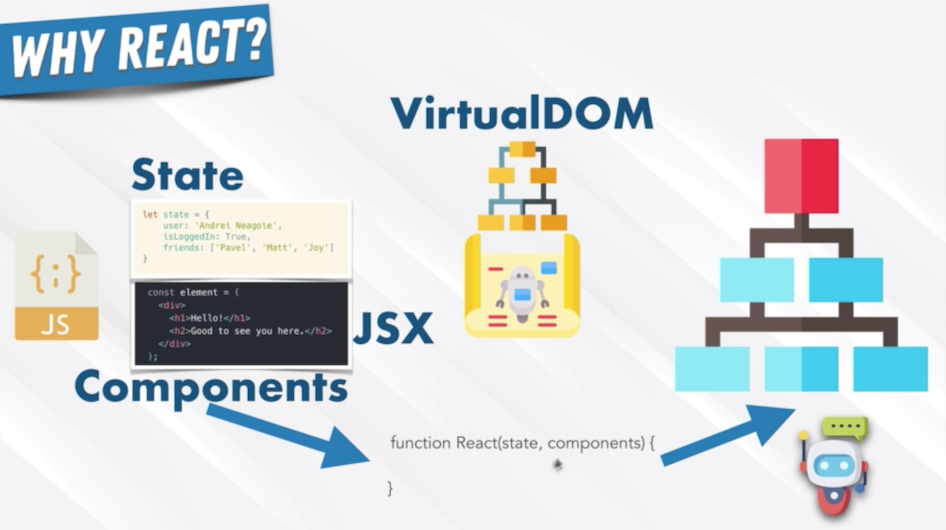 리액트는 재사용이 가능한 컴포넌트를 만들고, 이 컴포넌트들이 모여 웹사이트를 구성하게 된다. 이 컴포넌트들은 결국 자바스크립트 함수(또는 객체)이다. state를 세팅하고, 이를 기반으로 화면에 어떻게 보여지기를 원하는지를 작성하여 하나의 컴포넌트를 구성한다.