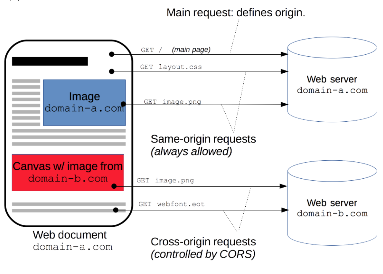 도대체 이게 무슨 말이냐.. 할 수 있으니 우선 cross-origin HTTP 요청부터 살펴보자면, 예를 들어 http://soldonii.com 이라는 사이트의 프론트엔드 자바스크립트 코드에서 XMLHttpRequest(또는 fetch)를 이용해 http://doniisol.com/data.json 데이터를 요청할 경우가 바로 cross-origin HTTP 요청에 해당된다. 자신(soldonii)과 다른 출처(doniisol)의 리소스(data.json)를 요청하는 행위이기 때문이다.
